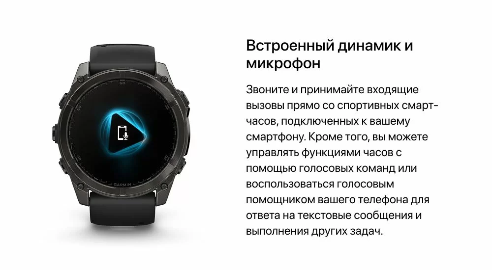Fenix 8 оснащены встроенным микрофоном и динамиком, что позволяет записывать голосовые сообщения и совершать звонки прямо с часов, предварительно подключив их к смартфону. Пользователь также может управлять различными функциями с помощью голосовых команд. Например, можно активировать голосового помощника Siri, Samsung или Google, в зависимости от того, какой установлен на сопряжённом с часами устройстве. Без подключения к телефону доступен голосовой помощник Garmin Voice Assistant, который выполняет основные функции смарт-часов через голосовые команды, упрощая взаимодействие с устройством.