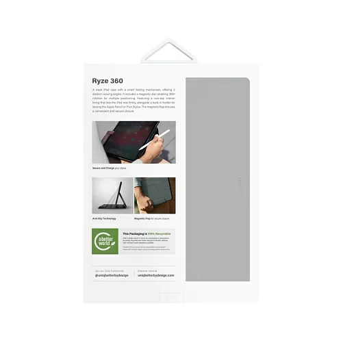 Тонкий защитный чехол Ryze 360 изготовлен из приятной на ощупь искусственной кожи. Продуманная складная конструкция дает возможность просмотра iPad на трёх различных вариантах высоты. Специальный магнитный диск позволяет вращать планшет на 360 градусов для выбора оптимального положения. Противоскользящая внутренняя подкладка помогает фиксировать устройство под разными углами. Благодаря встроенному держателю для хранения и зарядки Apple Pencil стилус всегда будет под надежной защитой и не потеряется. Встроенные в обложку магниты предотвратят случайные открытия и обеспечат включение/выключение планшета при открывании чехла (активация sleep-функции). Заглушки, интегрированные в чехол, защищают клавиши устройства от попадания грязи, пыли и воды.