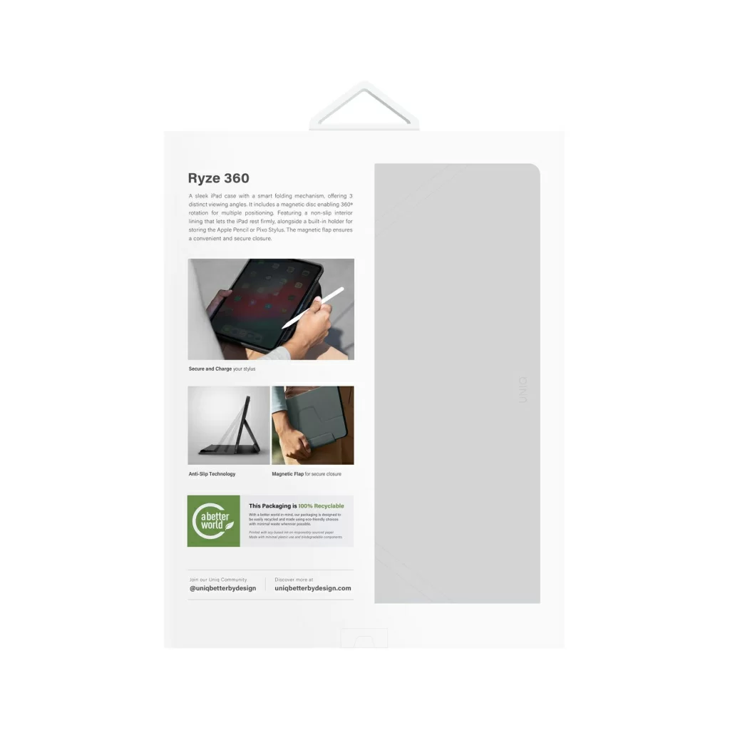 Тонкий защитный чехол Ryze 360 изготовлен из приятной на ощупь искусственной кожи. Продуманная складная конструкция дает возможность просмотра iPad на трёх различных вариантах высоты. Специальный магнитный диск позволяет вращать планшет на 360 градусов для выбора оптимального положения. Противоскользящая внутренняя подкладка помогает фиксировать устройство под разными углами. Благодаря встроенному держателю для хранения и зарядки Apple Pencil стилус всегда будет под надежной защитой и не потеряется. Встроенные в обложку магниты предотвратят случайные открытия и обеспечат включение/выключение планшета при открывании чехла (активация sleep-функции). Заглушки, интегрированные в чехол, защищают клавиши устройства от попадания грязи, пыли и воды.