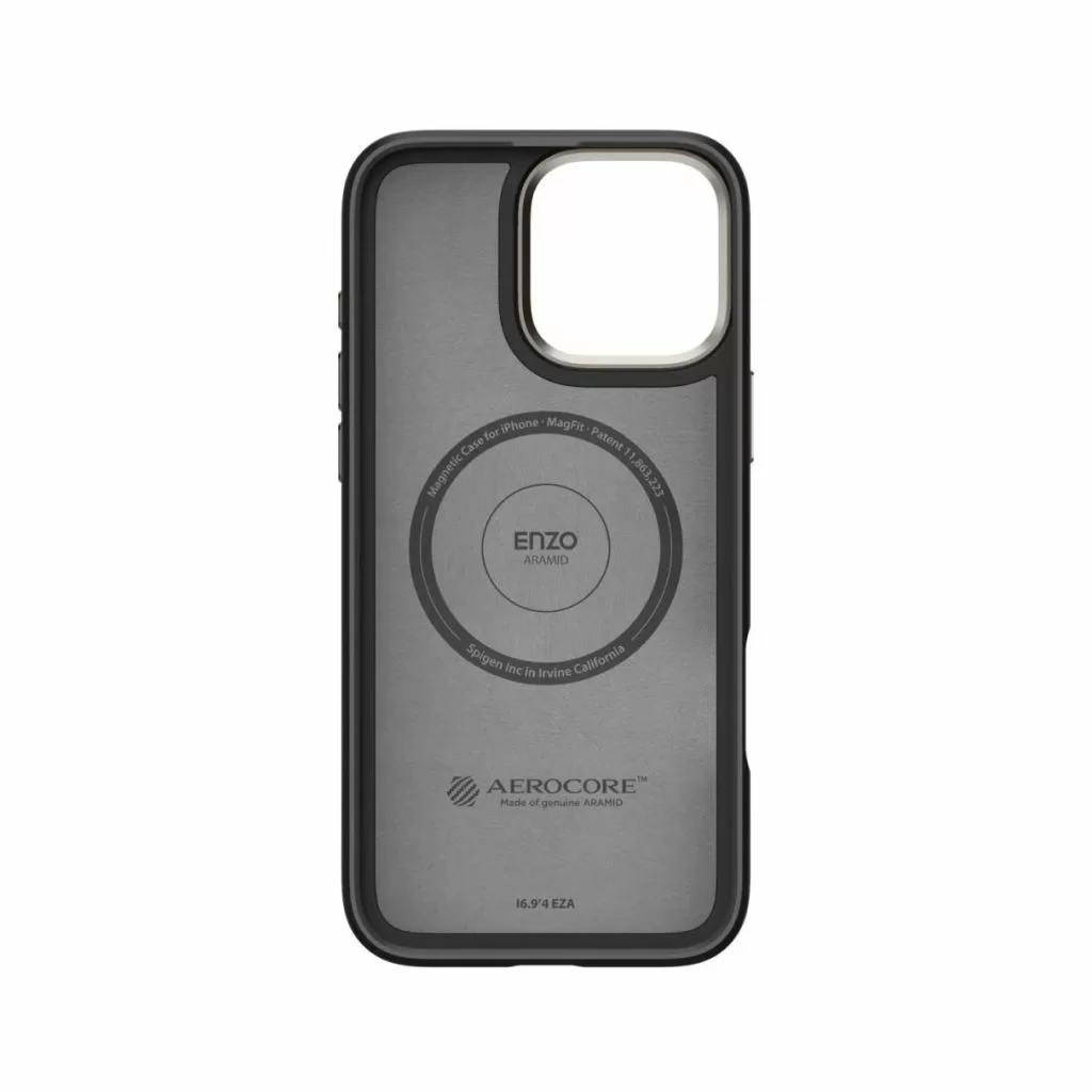 Spigen Enzo Aramid Magsafe — чехол, сочетающий в себе новейшие технологии и материалы, обеспечивающий максимальную защиту вашего смартфона, не жертвуя при этом его элегантным внешним видом. Он изготовлен из усовершенствованного арамидного волокна, известного своей необычайной прочностью. Точная алюминиевая отделка не только придает ему уникальный внешний вид, но и обеспечивает дополнительную защиту от ударов и повреждений.
