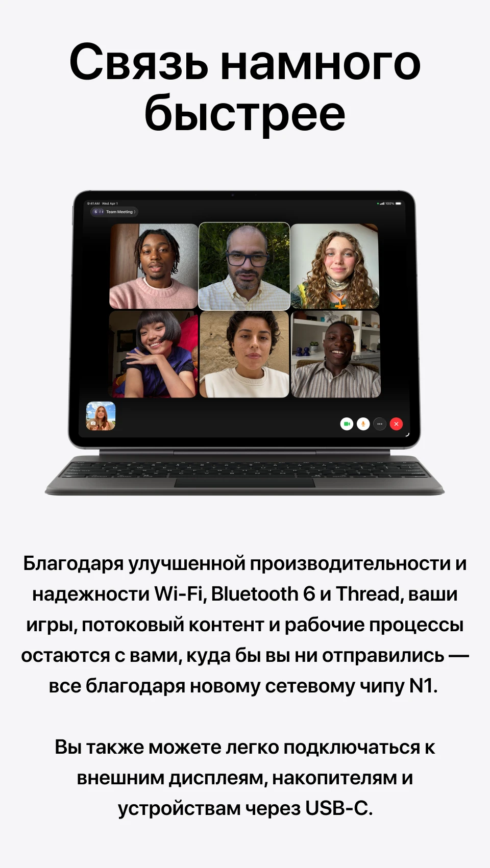 Это обновление, которое не видно глазом — и которое ощущается каждый день. Чип Apple N1, впервые появившийся в iPhone 17, принёс iPad Air поддержку Wi-Fi 7: скорость соединения с совместимым роутером теоретически втрое выше, чем у Wi-Fi 6E. На практике важнее другое — N1 значительно улучшает стабильность Personal Hotspot и AirDrop, которые теперь работают надёжнее между устройствами Apple. Добавлен Bluetooth 6 и поддержка протокола Thread для экосистемы умного дома.