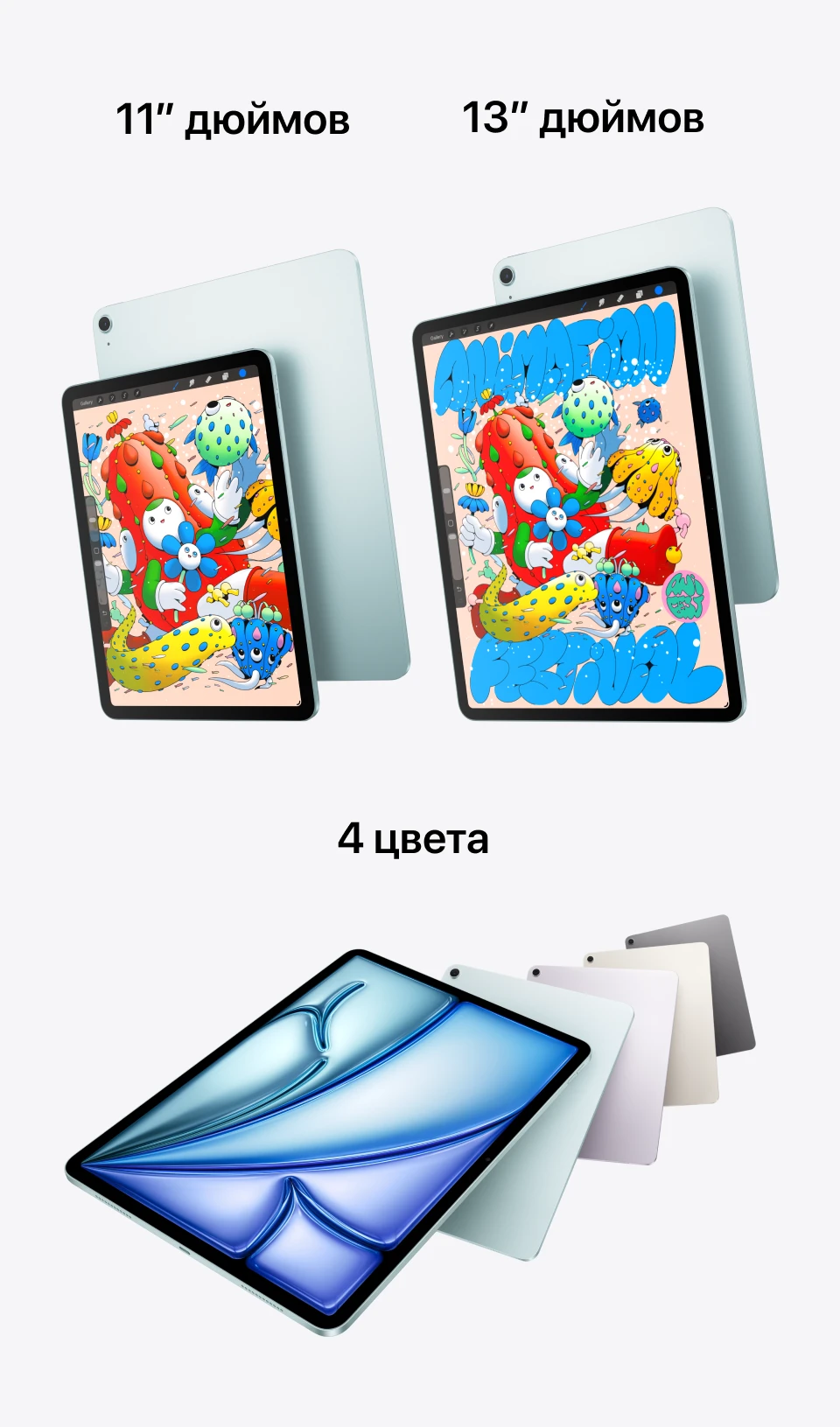 Выбор между 11 дюймами (2360 × 1640 пикс.) и 13 дюймами (2732 × 2048 пикс.) — это выбор образа жизни, а не компромисс по качеству. Оба дисплея Liquid Retina одинаково хороши: полная ламинация устраняет воздушный зазор между стеклом и панелью, антибликовое покрытие обеспечивает наименьшее отражение среди планшетов отрасли, а True Tone подстраивает цветовую температуру под окружающее освещение. Широкий цветовой охват P3 делает изображение точным и насыщенным — важно при ретуши фотографий и работе с иллюстрациями.