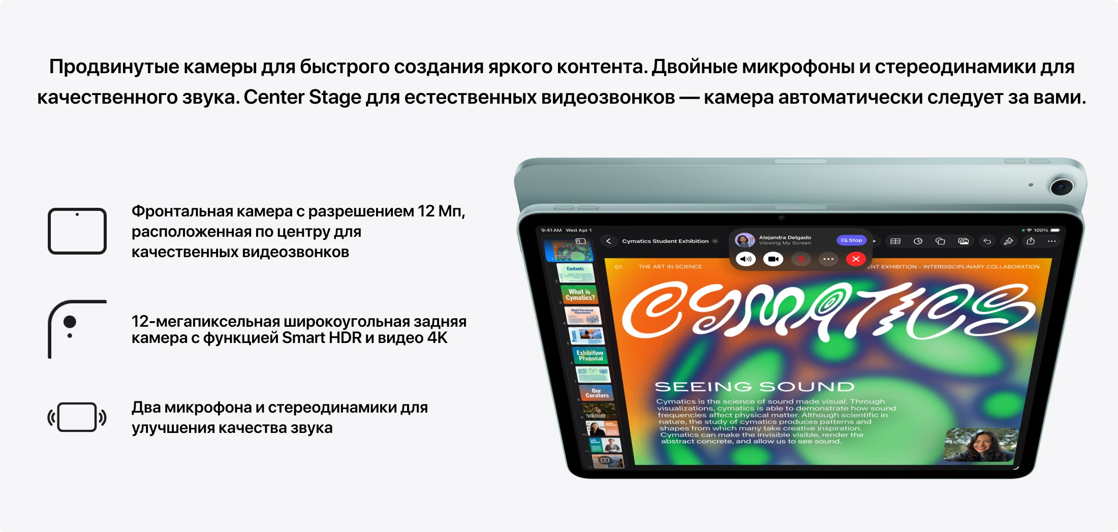 Основная камера — 12 МП, f/1.8 — записывает видео в 4K 60 fps с поддержкой Dolby Vision, Audio Mix и шумоподавлением ветра. Фронтальная 12 МП с Center Stage автоматически удерживает вас в центре кадра при видеозвонках, даже если вы встаёте и ходите. Стереодинамики обеспечивают широкую звуковую сцену — детали голосов и звуков при FaceTime-звонках различимы чётко.