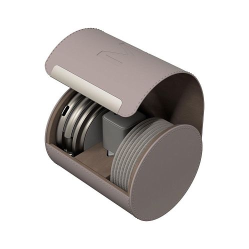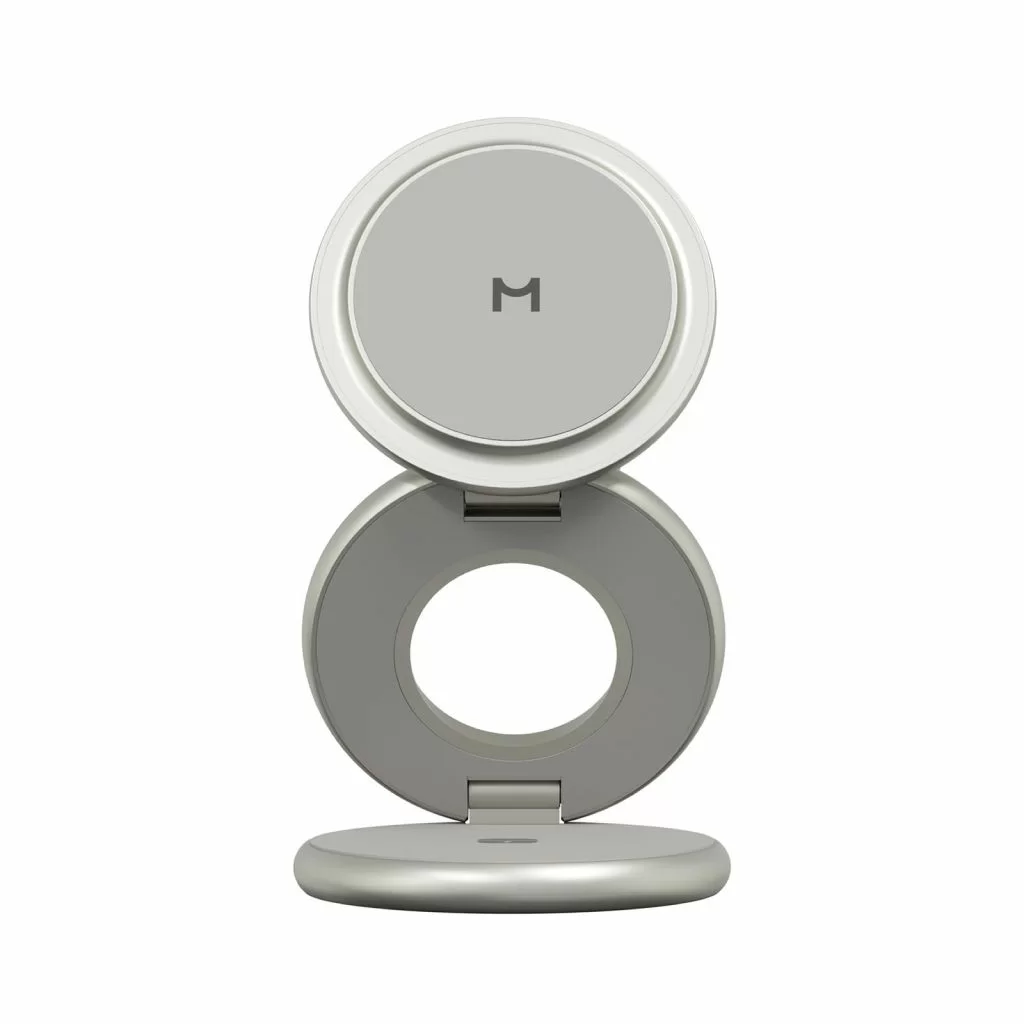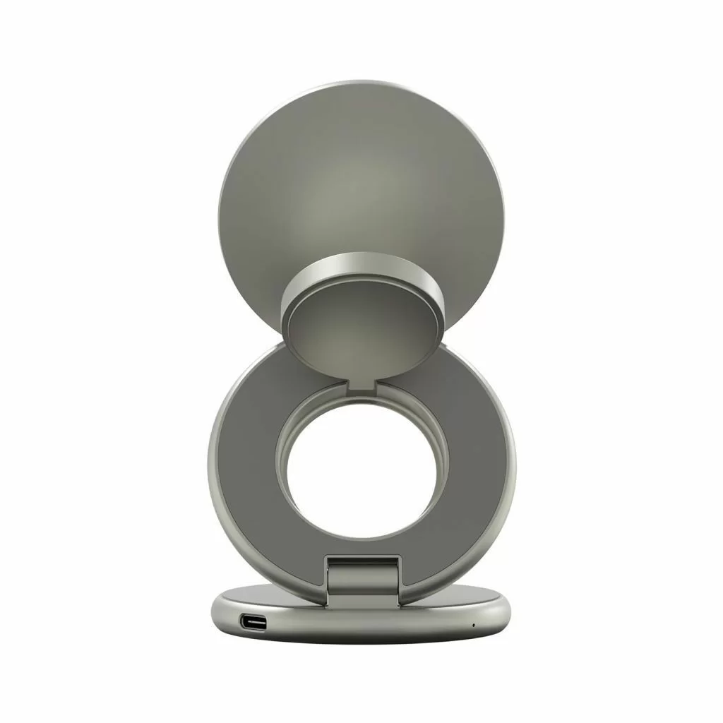 Корпус выполнен из прочного цинкового сплава с матовым покрытием и встроенными магнитами класса N52, которые надёжно удерживают устройства. Конструкция складывается в три сегмента, что делает зарядку максимально компактной и удобной в дороге. В комплекте предусмотрен кожаный кейс, идеально подходящий для переноски и защиты.