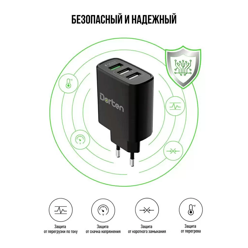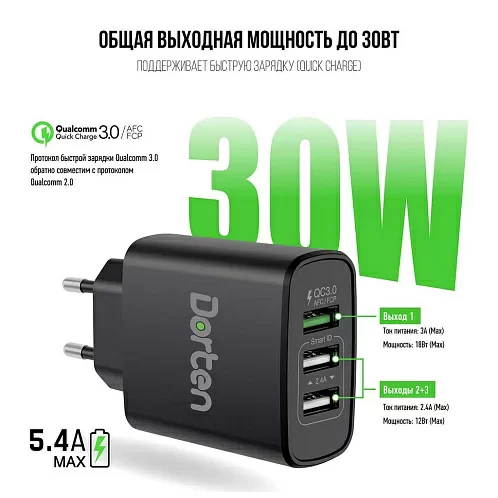 Dorten 30W QC+2 USB - это универсальный зарядник, который подойдет для любых устройств, включая планшеты, смартфоны и сотовые телефоны. С тремя разъемами USB вы можете заряжать три устройства одновременно, а один из трех разъемов поддерживает быструю зарядку до 80% за 25 минут благодаря технологии быстрой зарядки QC 3.0. Другие два порта USB обеспечивают быструю зарядку в общей сложности до 12Вт.