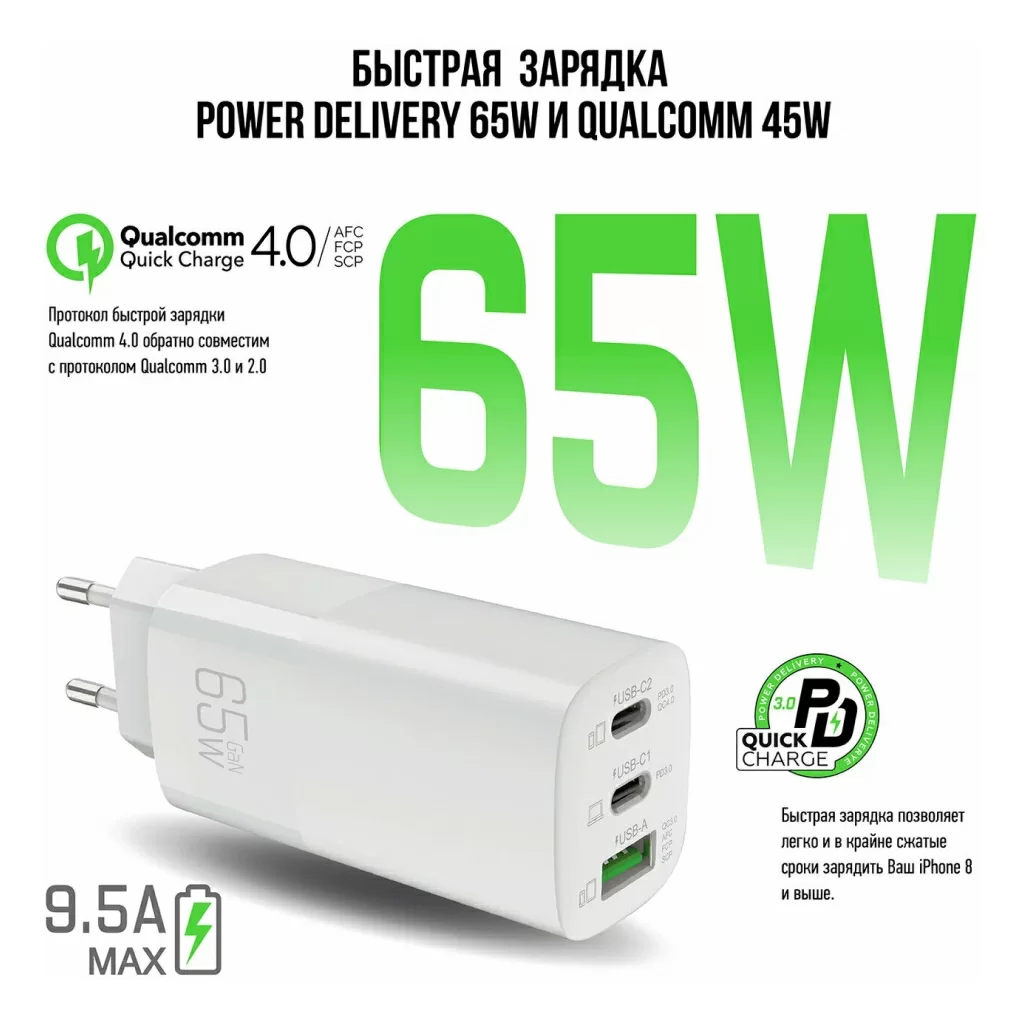 Чипсет Smart ID обеспечивает наиболее эффективную зарядку одного большого устройства или любых трех устройств, определяя, когда используется каждый порт, и соответствующим образом распределяя оптимальную мощность. Smart ID автоматически определяет тип подключенного устройства и обеспечивает его необходимой именно для этого устройства силой тока и мощностью питания. Встроенная защита от перегрузки по току и перенапряжению обеспечивает постоянную безопасность вашего адаптера питания и подключенных устройств.