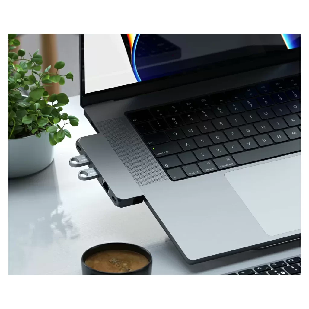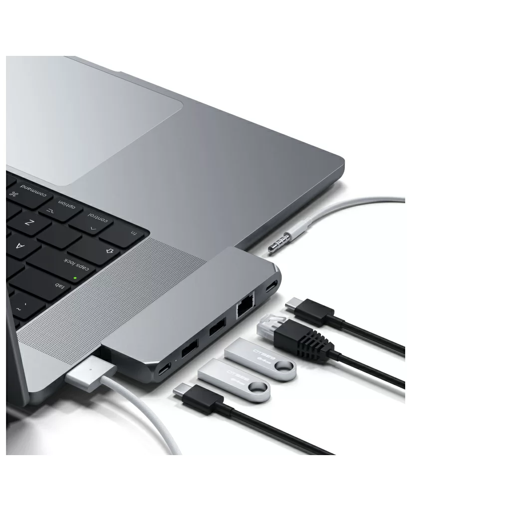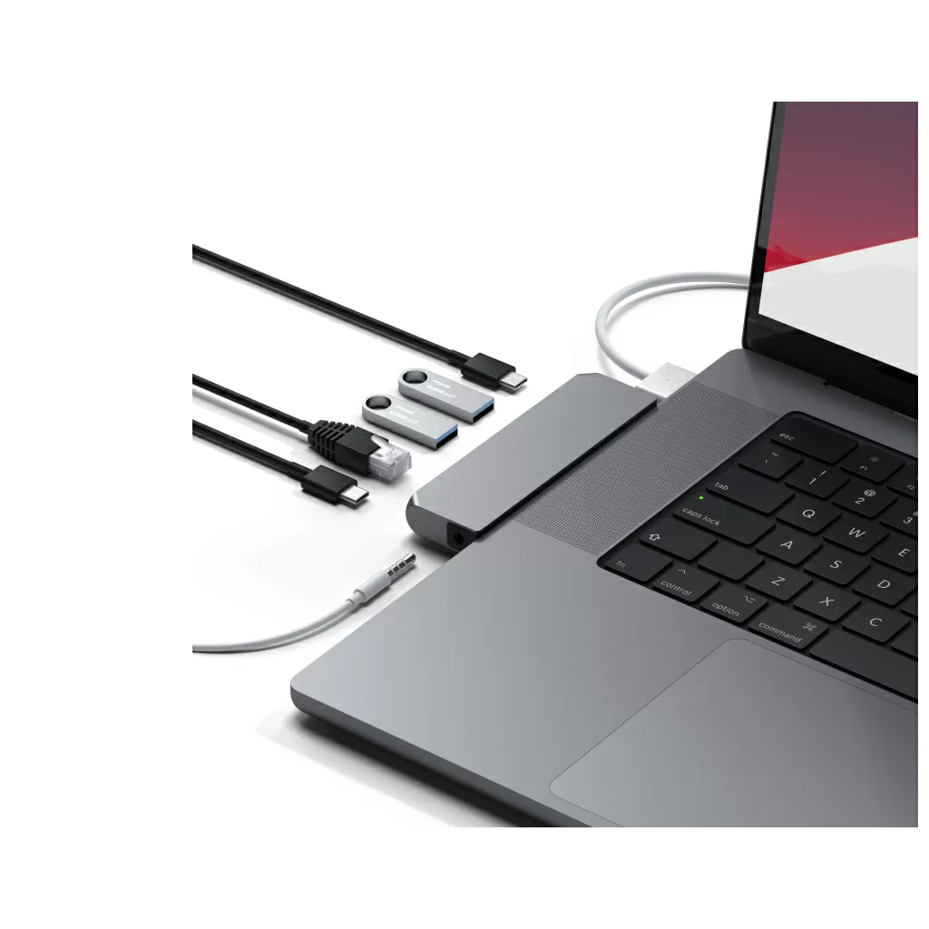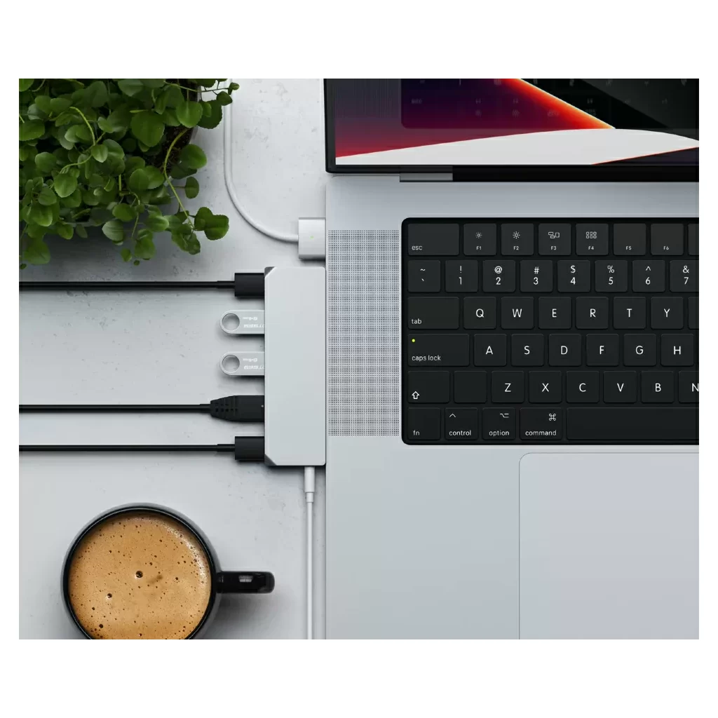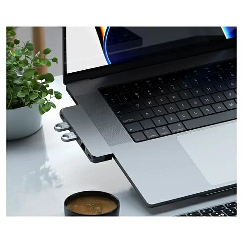 Компактный алюминиевый корпус Satechi Pro Hub Mini отлично сочетается c дизайном ноутбуков, поскольку аксессуар специально разработан для данных моделей. Для подключения используются два USB-C, а сам хаб не закрывает MagSafe. Кроме того, подключать зарядное устройство с разъёмом Type-C можно прямо через Pro Hub Mini. Поддерживаются адаптеры мощностью до 96 Вт.