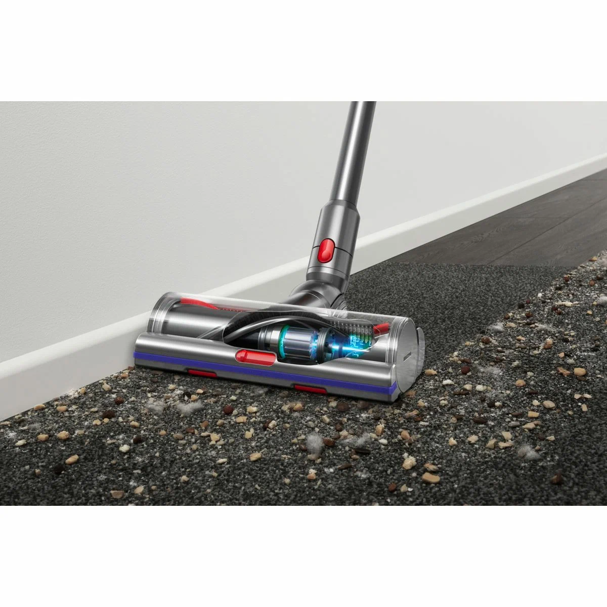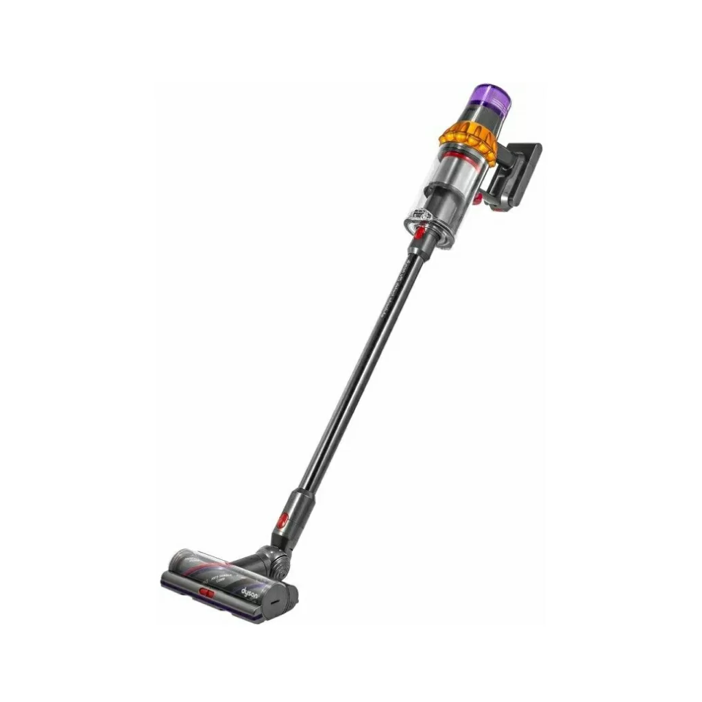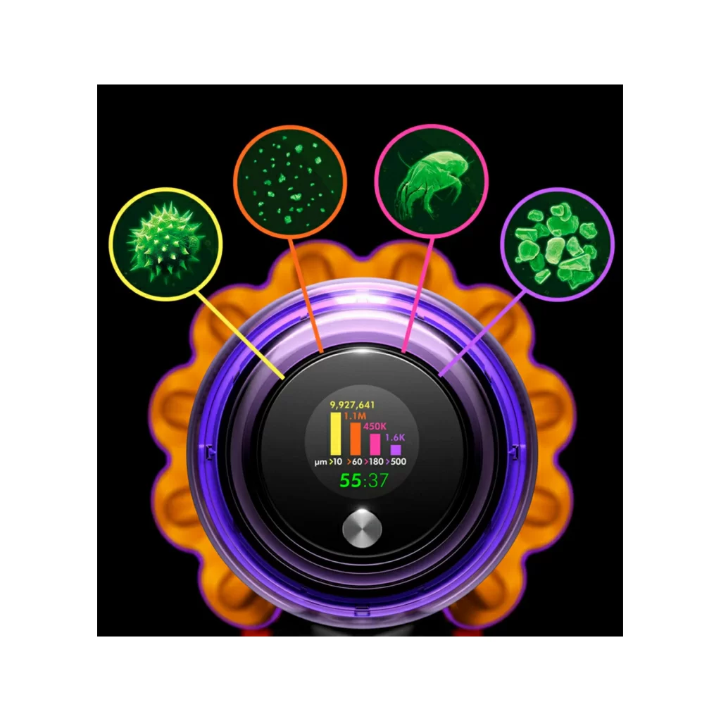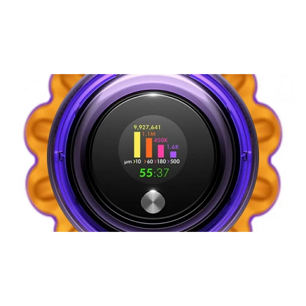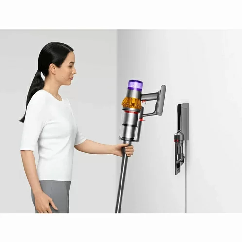 Модель оснащена циклонным фильтром, что обеспечивает простоту и удобство применения. Изделие отделяет частицы пыли, шерсть, волосы и мелкий бытовой сор от воздушного потока. Это повышает качество уборки, а также облегчает дыхание членов семьи. Специальная система извлечения мусора позволяет пользователю с легкостью освобождать контейнер. Для поддержания чистоты фильтр и насадку можно мыть в проточной воде. Вертикальный пылесос Dyson V15 Detect оснащен управлением электронного типа с дисплеем.