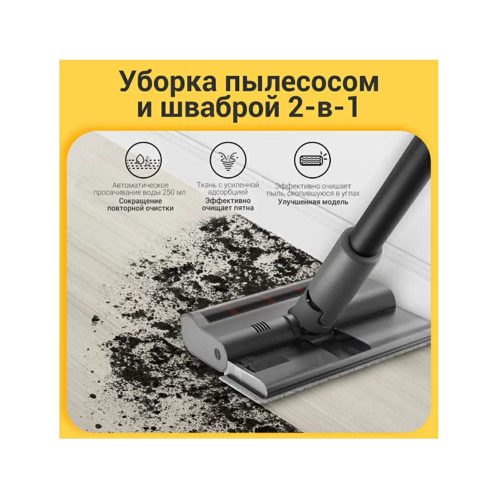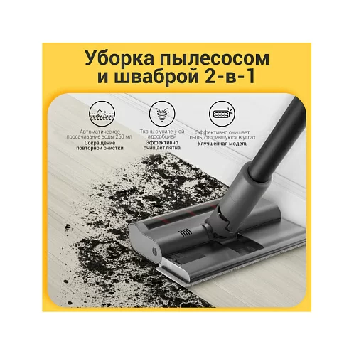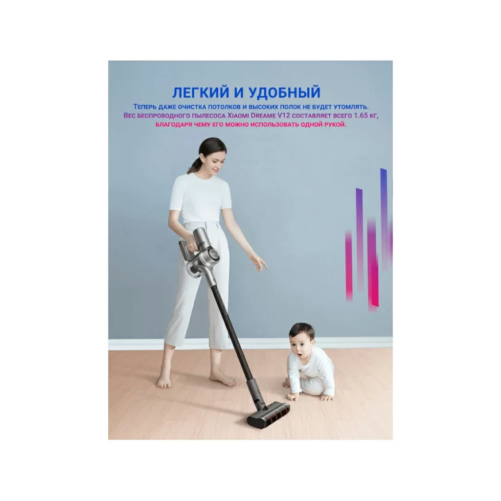 Dreame V12 оснащен электродвигателем со скоростью 150000 об/мин. Он поддерживает 3 режима работы, мощность всасывания достигает отметки 185 аВт. На одном заряда гаджет может отработать примерно 1,5 часа. Вместе с дополнительными насадками можно осуществить полноценную сухую уборку всего дома!