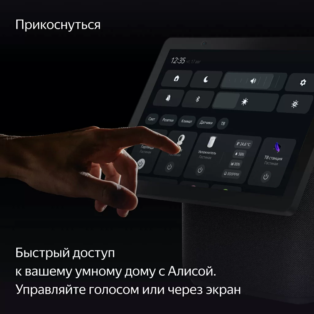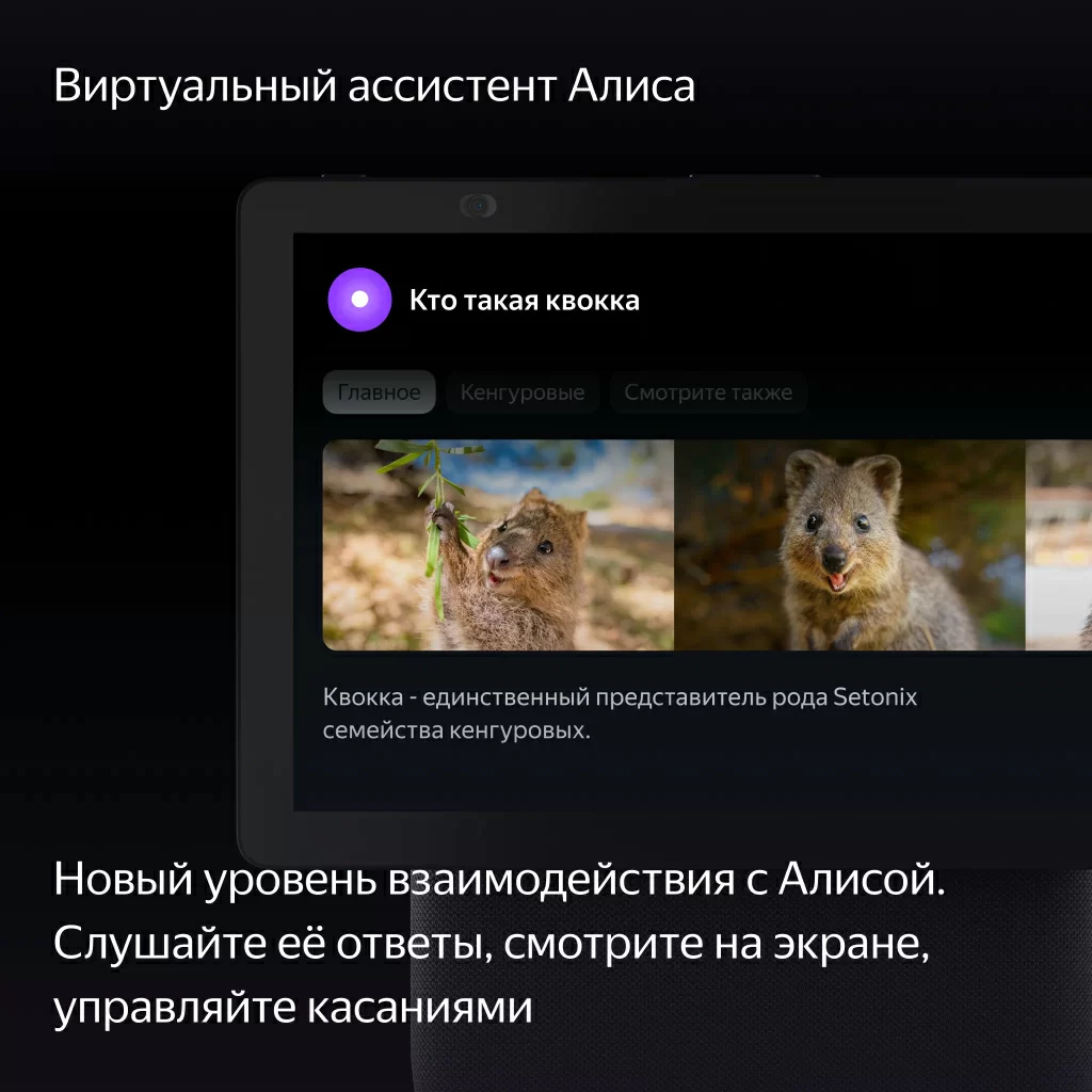 Просите Алису искать и включать музыку, фильмы или сериалы, а потом управляйте контентом на экране касаниями: перематывайте, ставьте на паузу и выбирайте нужное. Смотрите телеканалы. Задавайте Алисе вопросы — и не только слушайте её ответы, но и смотрите их на экране. Или пользуйтесь браузером.