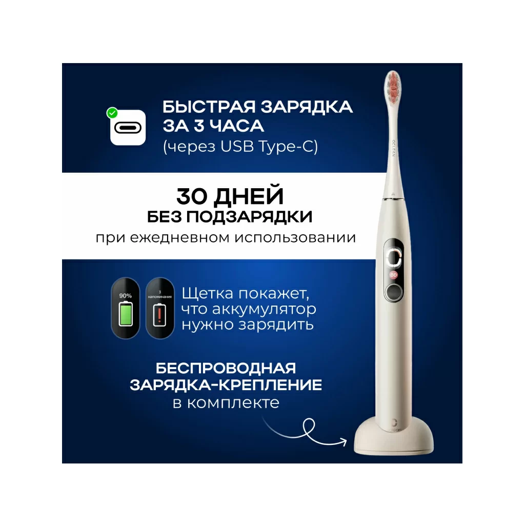 Быстрая зарядка: заряда аккумулятора хватает на 30 дней при одной быстрой зарядке в течение 2,5-3,5 часов. Создавайте индивидуальные программы и настраивайте время чистки с учетом состояния зубов и десен: чистка, отбеливание, массаж.